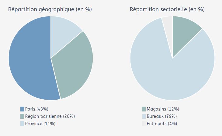 À l’instar de sa répartition géographique, la quasi-totalité des immeubles est consacrée à l’immobilier de bureau. Seule une partie résiduelle est constituée de magasins, de boutiques, et d’entrepôts.